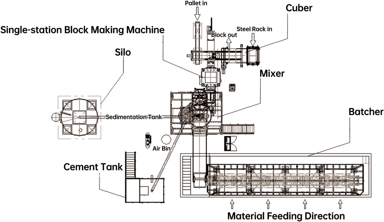 A linha de produção atinge a formulação precisa do material por meio de um sistema de dosagem e mistura. Os materiais são transportados através de correias e elevados até o misturador, onde ocorre uma mistura completa antes de serem transferidos para o misturador de material de revestimento. A mesa principal da prensa desliza para fora e, durante a alimentação do material na superfície, um funil dosador distribui com precisão o material na estrutura do molde na mesa deslizante. A mesa então se move sob a estrutura da prensa para formação de filtração por prensa. Enquanto isso, os paletes são entregues na posição secundária da mesa pelo alimentador de paletes. Durante o próximo ciclo de dosagem, os tijolos formados são automaticamente desmoldados. O sistema completa de forma síncrona a alimentação dos paletes e a remoção dos tijolos úmidos durante o processo de prensagem, garantindo uma produção eficiente e contínua.