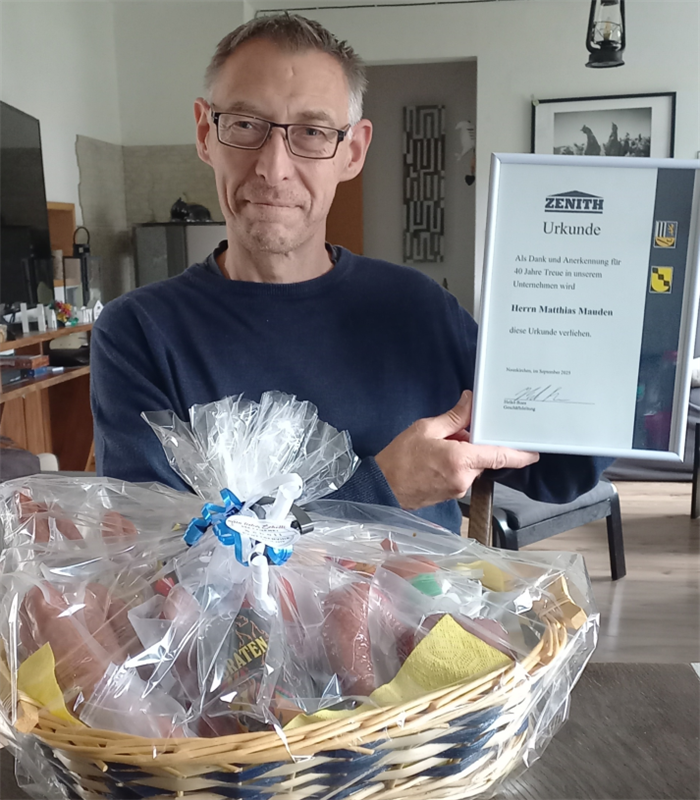 O Sr. Matthias Mauden, de 57 anos, está na Zenith desde que concluiu um programa de formação de instalador mecânico de três anos. Ao longo dos anos, tem atuado na área de engenharia hidráulica, possuindo profundo conhecimento em cilindros hidráulicos e vibradores. Ao mesmo tempo, também atuou ativamente como socorrista na empresa, garantindo a segurança de seus colegas. Os seus quarenta anos de dedicação testemunharam a brilhante jornada do seu crescimento ao lado da Zenith.