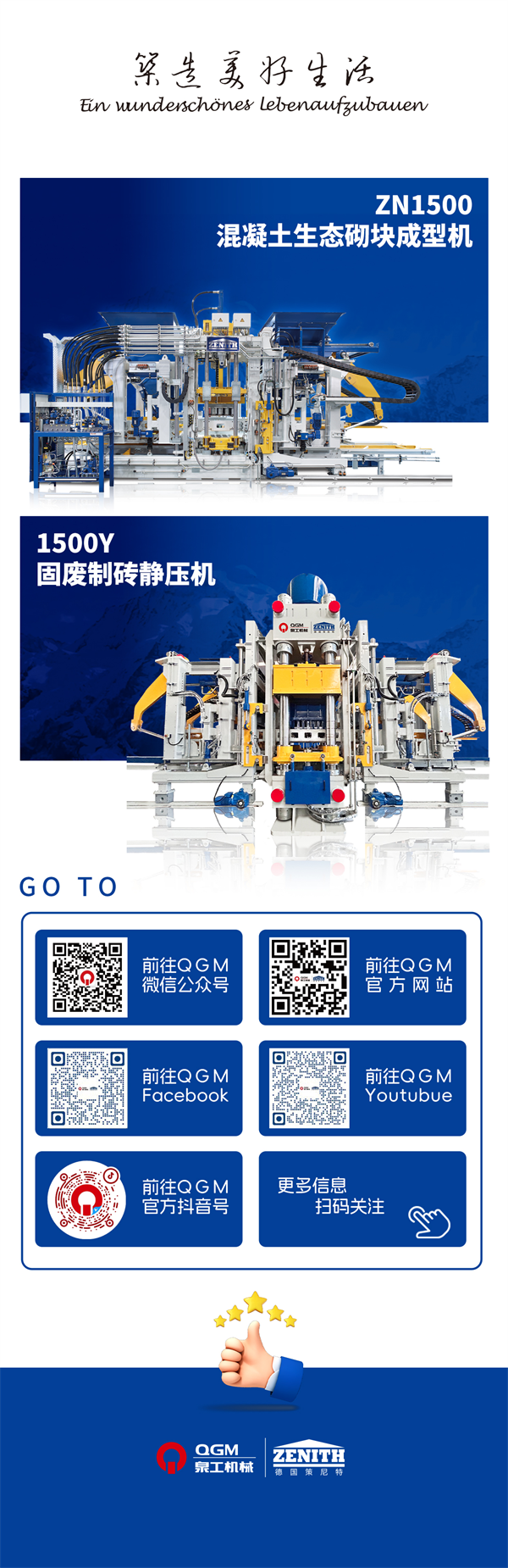 Como marca líder na indústria doméstica de máquinas de tijolos, a QGM tem sido consistentemente classificada entre as empresas líderes em Quanzhou há muitos anos. Até o momento, a empresa garantiu mais de 300 patentes de produtos, 21 das quais são patentes de invenção autorizadas pelo Escritório Estadual de Propriedade Intelectual. Em 2014, a empresa adquiriu totalmente a Zenith, um fabricante alemão de renome mundial de máquinas de tijolos sem paletes com mais de 60 anos de história, lançando oficialmente a sua expansão estratégica global. Ao integrar totalmente a tecnologia alemã avançada e aproveitar as suas décadas de experiência em fabricação, a QGM inovou e desenvolveu continuamente uma série de modelos de alta qualidade competitivos internacionalmente. Estes produtos são exportados para mais de 60 países e regiões ao longo da Iniciativa Cinturão e Rota, ganhando elevado reconhecimento no mercado global.