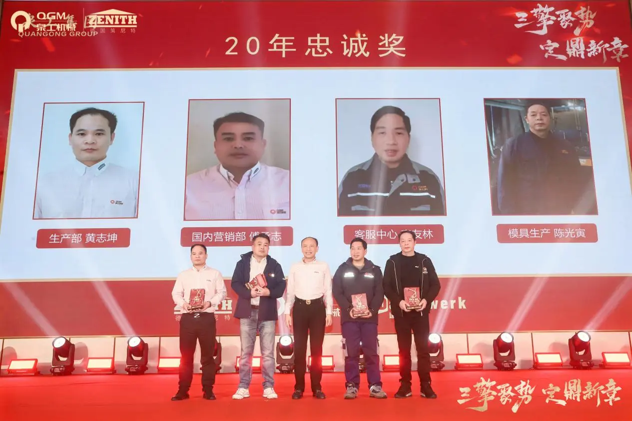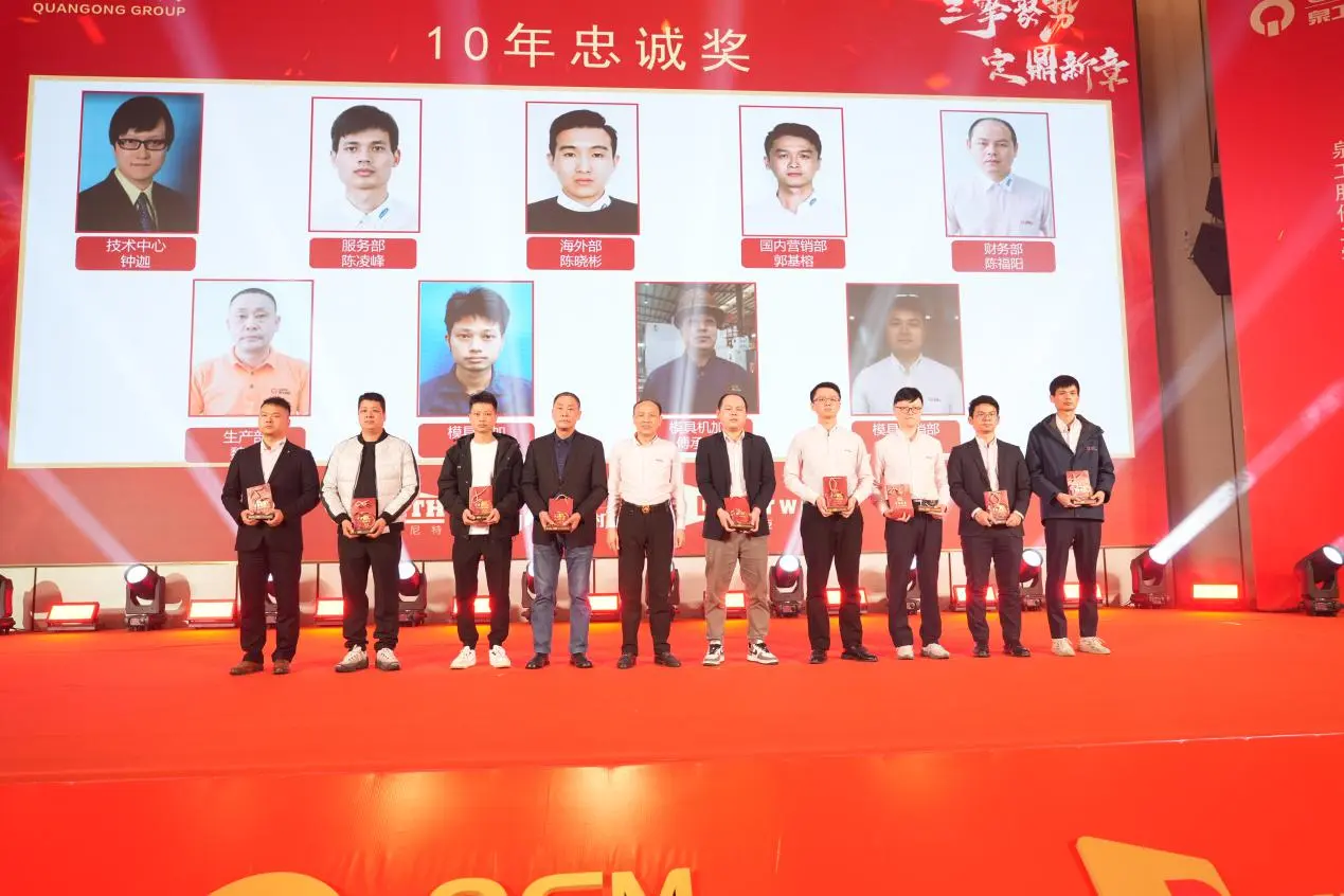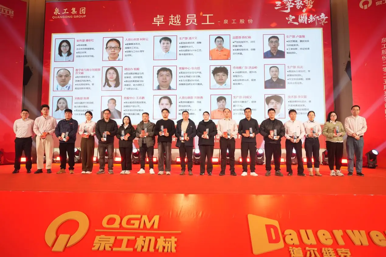 Durante a reunião anual, também foi realizada uma grande cerimônia de premiação para prêmios de fidelidade de 10, 20 e 30 anos. Um grupo de funcionários que caminharam de mãos dadas com a empresa e cresceram juntos subiu ao palco, demonstrando plenamente a base sólida do desenvolvimento constante da Quangong Machinery Co., Ltd. e sua cultura corporativa duradoura.