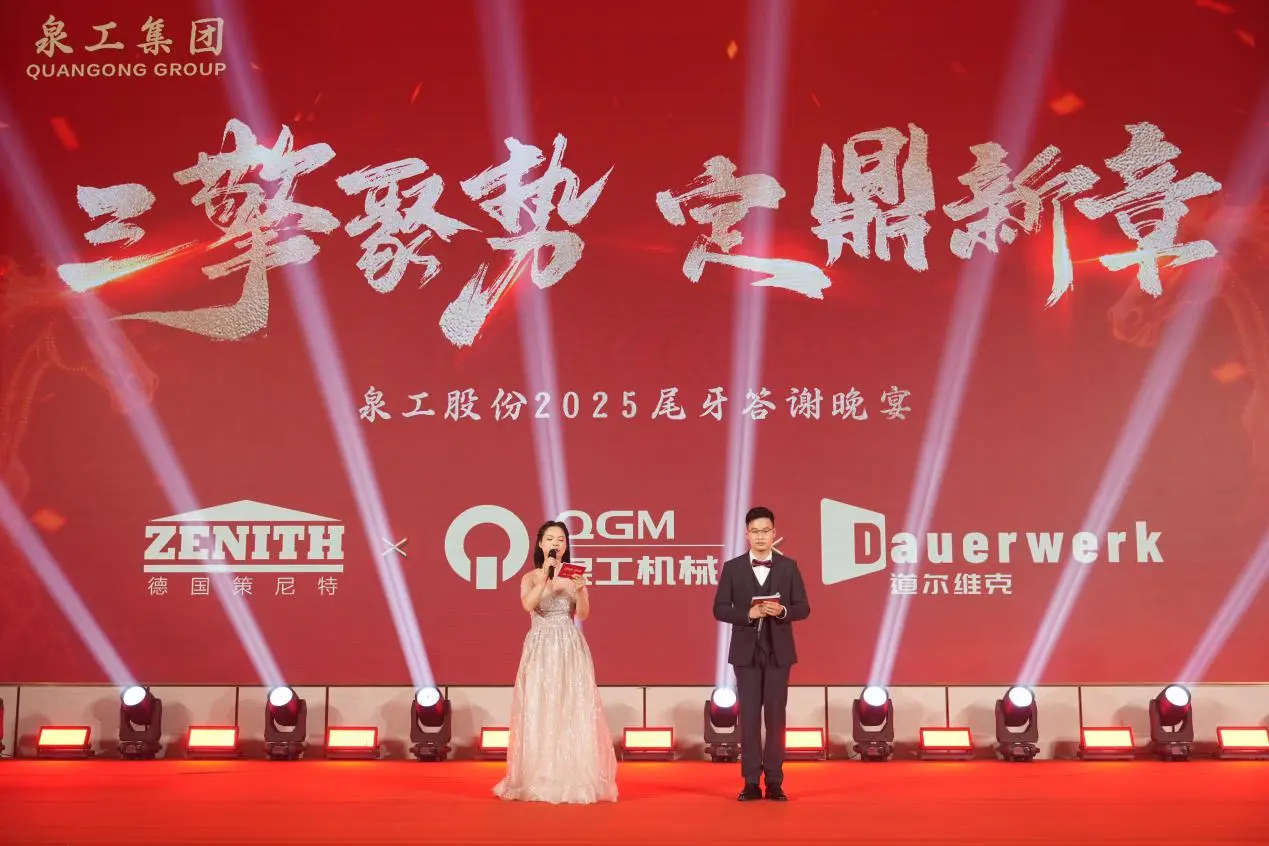 Na tarde de 3 de fevereiro,Máquinas Co. de Fujian Quangong, Ltd.realizou seu Resumo Anual e Cerimônia de Premiação de 2025 e celebração de Ano Novo no Quanzhou Donghai Honor Hotel, sob o tema "Três motores convergindo, estabelecendo um novo capítulo". Os líderes da empresa, os principais representantes dos clientes, todos os funcionários e suas famílias reuniram-se para rever a jornada de trabalho árduo, compartilhar as conquistas de desenvolvimento e esperar um futuro brilhante.